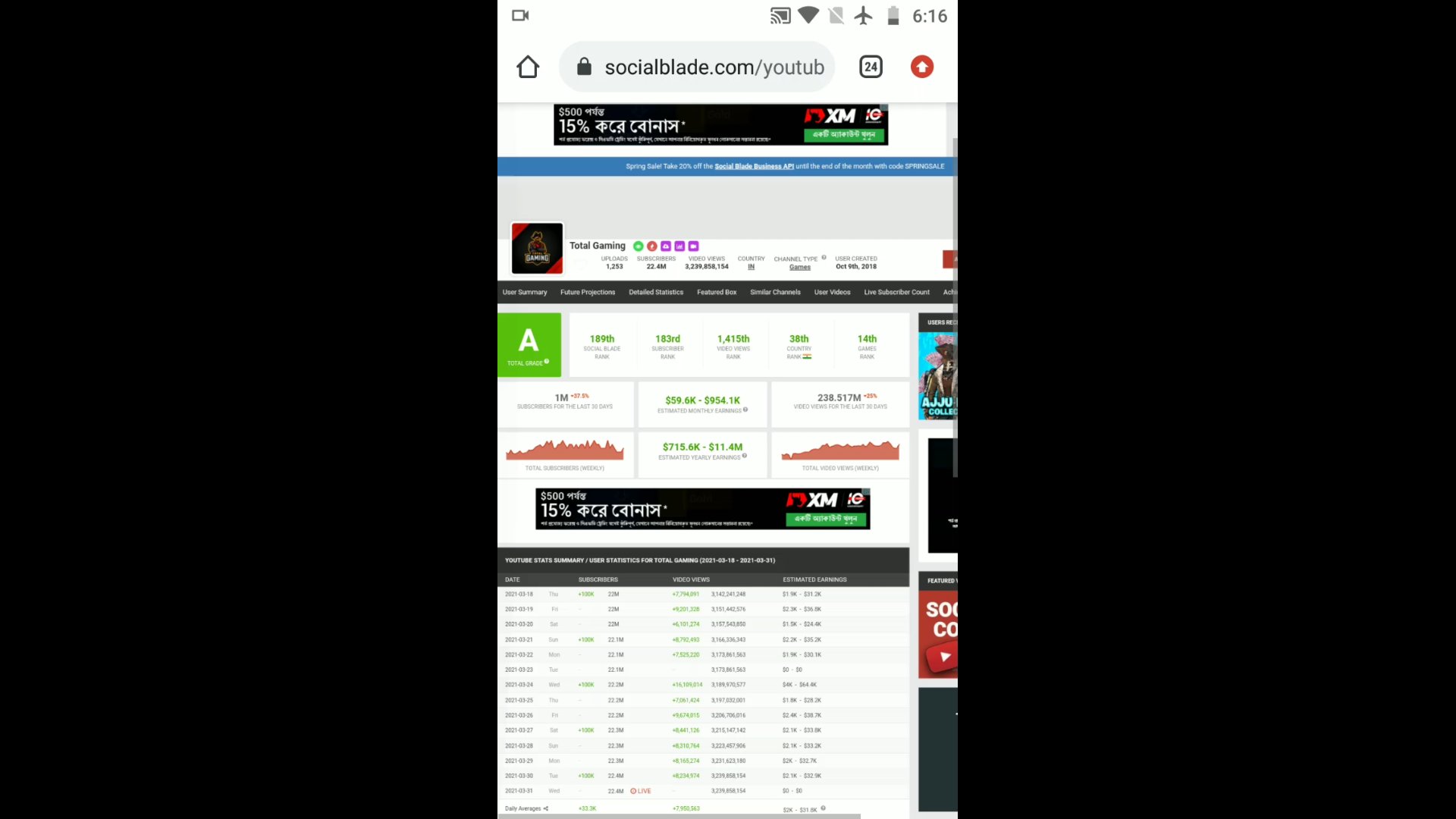 Tolat gaming is indias most subed youtube gaming channel.Heplays FreeFire Battale royal and do lives stream on his channel his monthly earning is almost 59k us dollars per monts